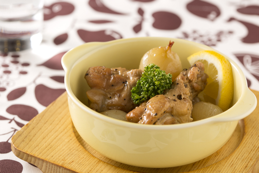 鶏手羽元と小玉ねぎをレモンで煮た爽やかな一品。おもてなしにもぴったりです!