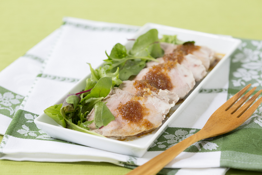 シャトルシェフでしっとり仕上げた茹で豚に手作りのたまねぎソースをたっぷりそえて。冷たくしていただきます。