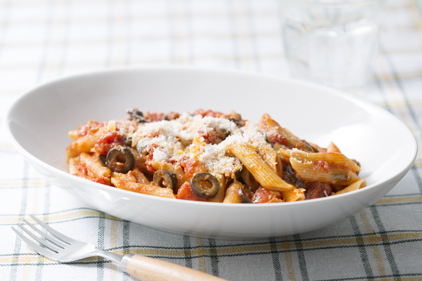 娼婦風パスタと呼ばれ缶や瓶詰めの材料を使ったものです。シャトルシャフで乾麺のまま入れて仕上げます。