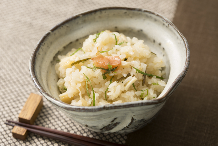炊き上がったらご飯をつぶさないように全体を混ぜ、蓋をして15分程蒸らす。梅干しの種を取り除き、白ごまと青しその葉を混ぜ、器に盛り付ける。