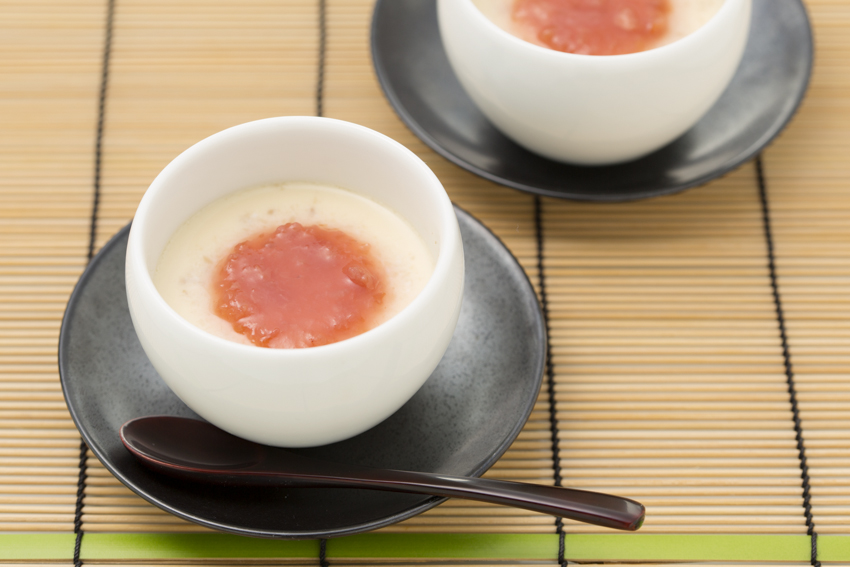 卵液に梅肉を入れて蒸します。梅肉ソースをのせて仕上げた優しい味わいの暑い夏に食べたい茶碗蒸し。