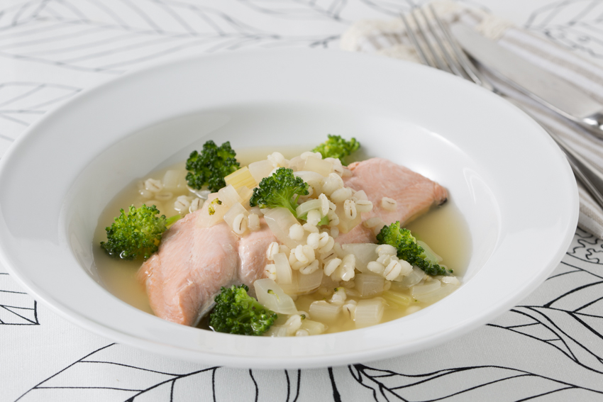 (2)に鮭と大麦、ブロッコリーを加えて保温容器で20分保温する。