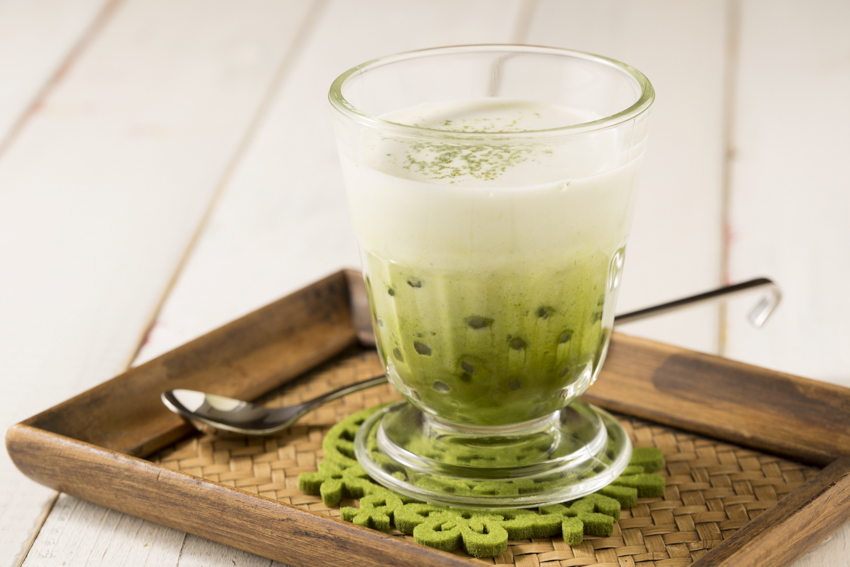 抹茶、砂糖をお湯で溶かし、冷やしたココナッツミルク、牛乳と合わせ、タピオカと共にグラスに注ぐ。