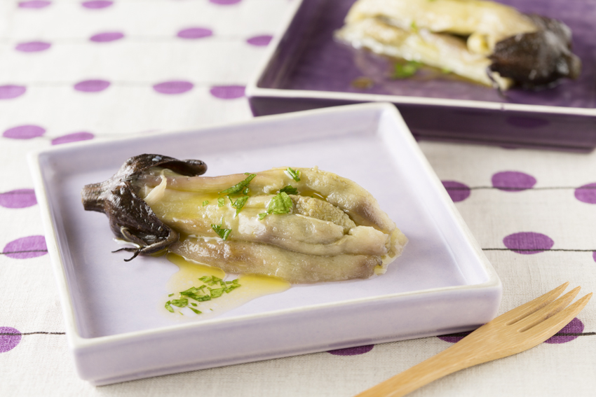 熱いうちにナスの皮をむき、ワインビネガー、オリーブオイル(2)、塩、こしょう、刻んだイタリアンパセリを合わせたものに漬け込み、冷やす。