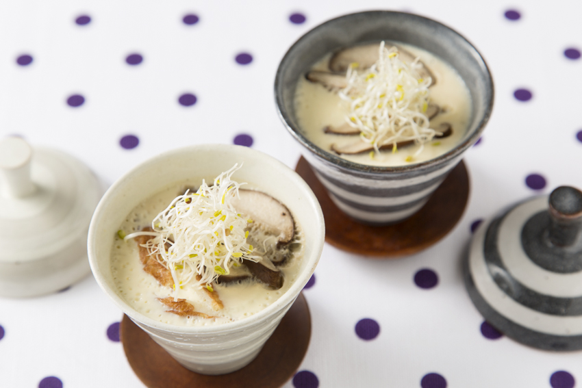 ダシを使わず、牛乳の旨みだけで仕上げる。生しいたけとちくわの旨みでコクのある味に。冷やして食べる。