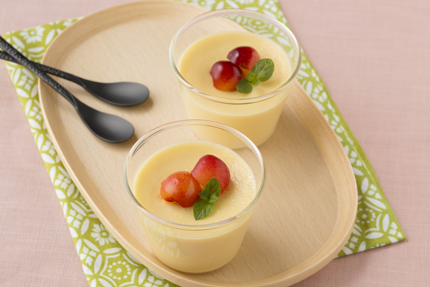 プリンカップごと冷蔵庫で冷やす。食べる直前に、さくらんぼなど、季節のフルーツを盛りつける。