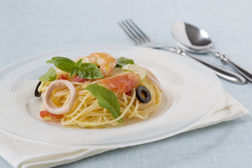 シャトルシェフで魚介類を軟らかボイル!ゆで汁でパスタも茹でられエコ調理!冷やしたパスタで魚介ソースでお召し上がりください。