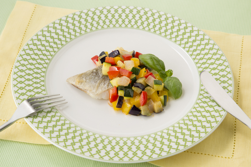 玉ねぎ1cm角、ズッキーニ・赤黄パプリカ・ナスなど1.5cm角に切る。トマトは1cm角に切り、ザルで水分を切る。