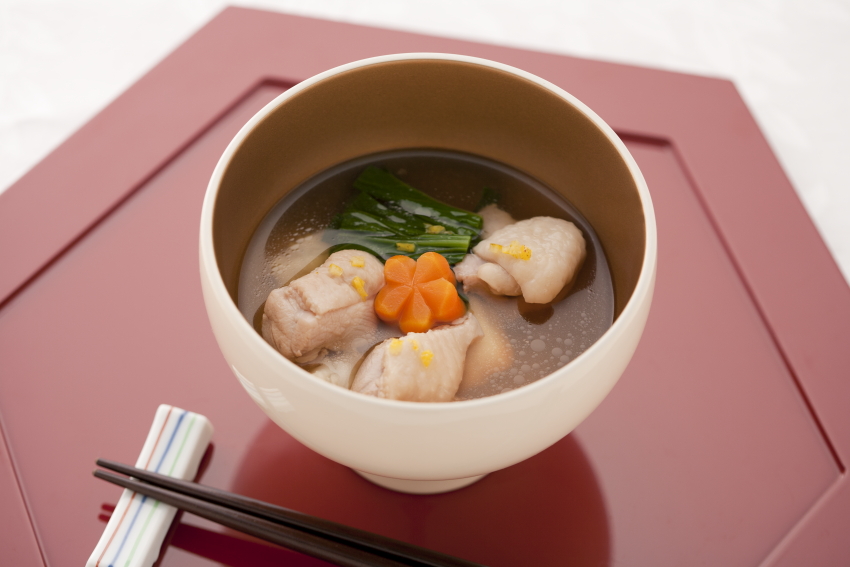 鶏もも肉は4cm角に切り、酒・塩をふり5分置き、熱湯をかけておく。小松菜は熱湯でゆで、4cm幅に切っておく。にんじんは2cm幅の輪切り、もしくは花切りにしておく。ゆず皮は松葉の形に切っておく。(千切りでもよい)