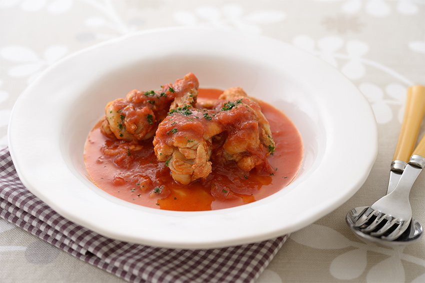 ピリッと辛いトマト煮込みの鶏肉。じっくり煮ることにより骨からのうま味がトマトにしみ出して、お店顔負けの味わいに。