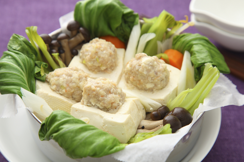 えび団子を豆腐と組み合わせました。たっぷりの野菜と共に蒸せば、とてもヘルシーな一品です。