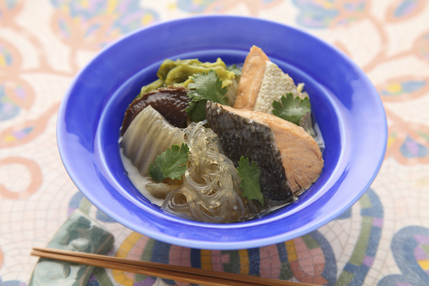 調理鍋に(A)を入れて煮立て、(1)の鮭、白菜の茎、干ししいたけを加え、ふたをして5分煮る。白菜の葉と春雨を加えて更に中火で5分煮、保温容器に入れ、10分保温する。