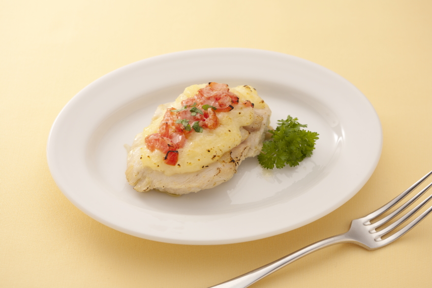 (1)で取り出した鶏肉をそぎ切りにして、天板に並べ、(3)のマッシュポテトとトマトを並べ、粉チーズをふりかけ、オーブントースターで表面に焦げ目がつくまで焼く。