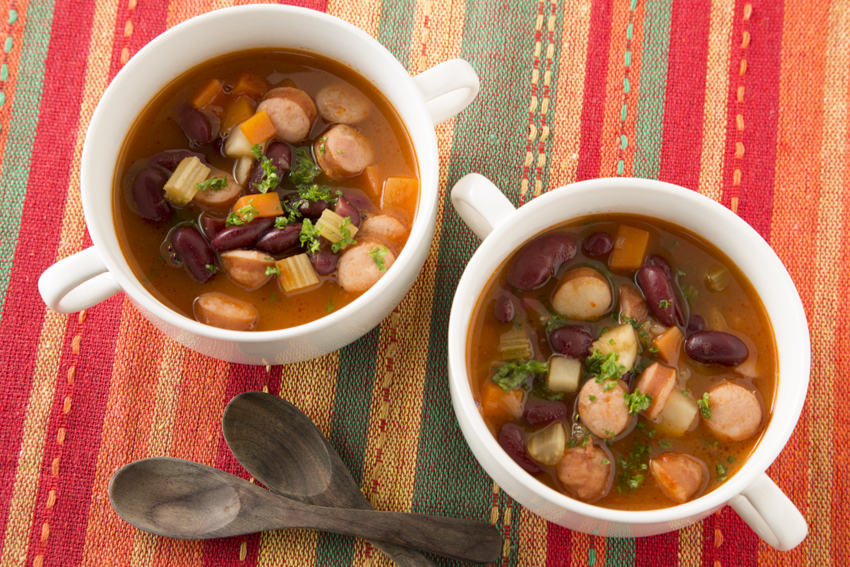 からだが温まるピリ辛のスープ。ウインナーや豆の水煮缶を使用し、手軽に作ります。