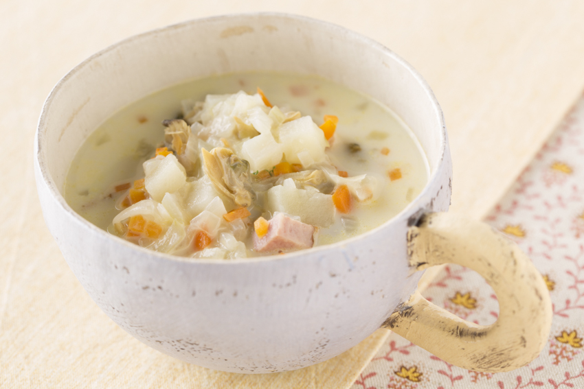 30分ほどしたら調理鍋をとりだし、牛乳を加えて軽く煮る。塩、胡椒で味を調える。