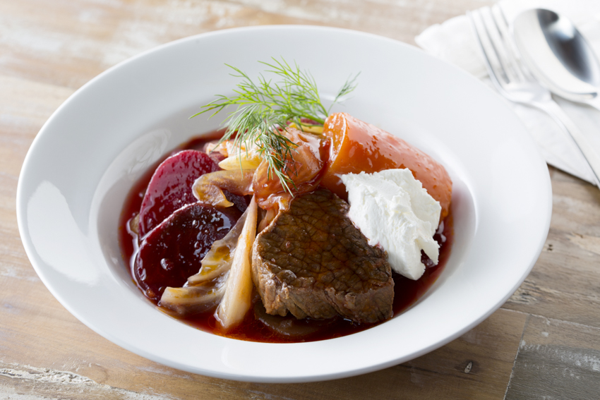 ロシアの定番料理「ボルシチ」。煮込まず保温容器で火を通します。