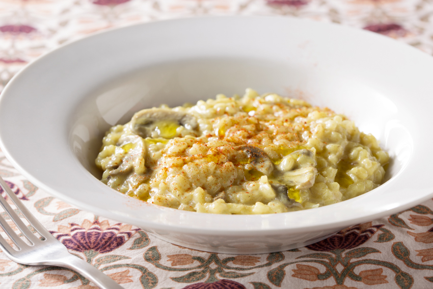 調理鍋にオリーブオイルとバターをあたため、玉葱、にんにく、生米を入れて炒める。米の周りが透き通ってきたらマッシュルーム加え、更に炒める。