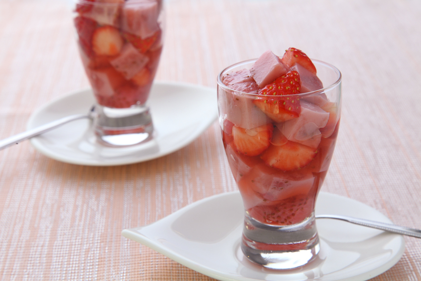 (5)のイチゴ寒天を1cm角に切る。小さめのグラスの容器に、イチゴのコンフィチュール、イチゴ寒天、切ったイチゴを重ねながら詰める。甘めがお好みなら、コンデスミルクをかけていただく。