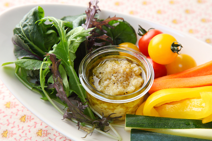 塩麹で旨味をつけたガーリックソースは、アンチョビのような旨味があります。ベジタリアンの方にもおすすめ。