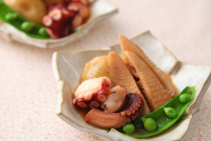 春の食材のたけのこと新じゃがが蛸のうま味の出汁を含んで、美味しい旬の煮物です。