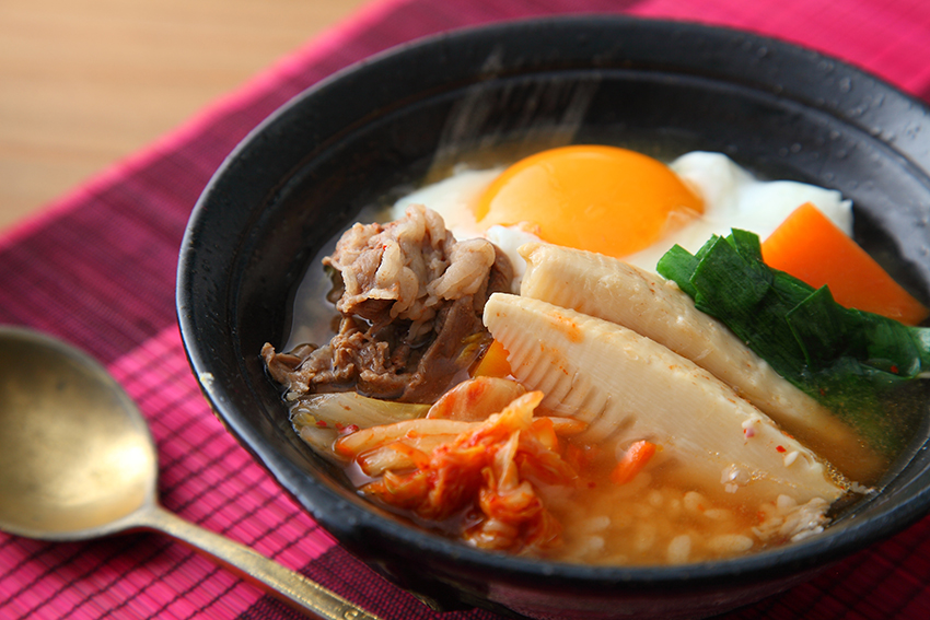たけのこの食感が楽しい野菜たっぷりの韓国風キムチ雑炊です。甘辛のスープが食欲をそそります。
