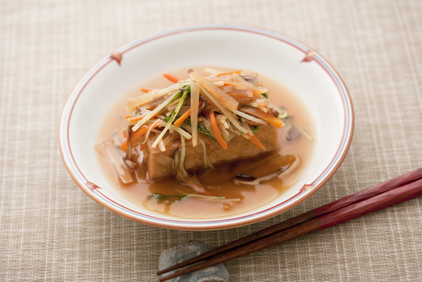 に(3)の厚揚げを盛り、(4)の五目野菜あんをかける。