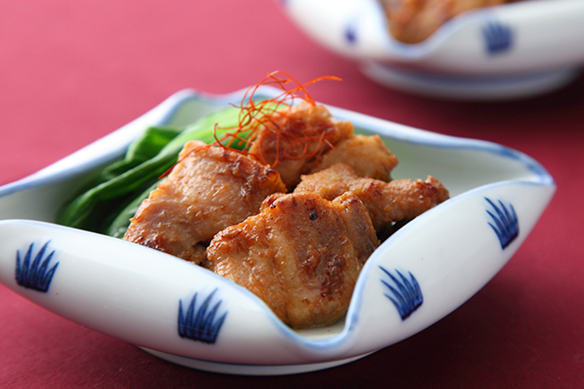 フライパンでさっと(2)の豚肉の表面を焼いてから皿に盛り、糸とうがらしをのせる。茹でたチンゲン菜を添える。