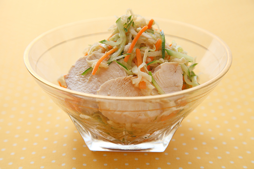 鶏ムネ肉は保温調理でしっとり仕上がります。きゅうりや切干大根の歯ごたえとを合わせた食感が楽しい中華風サラダです。