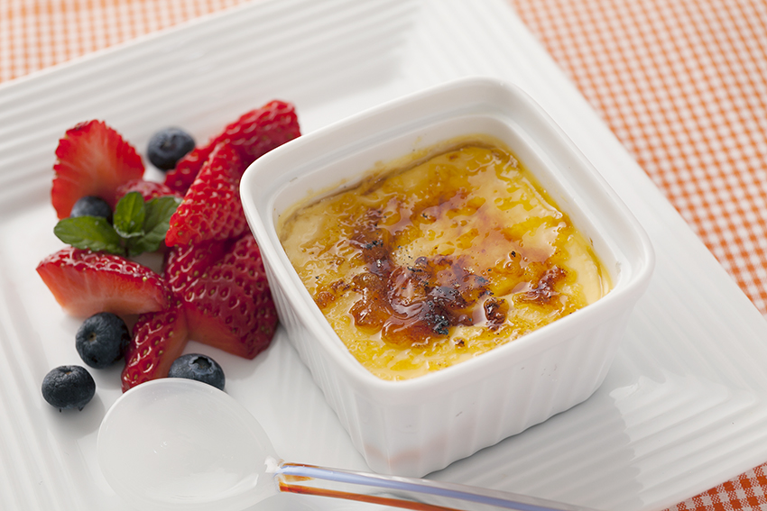食べる直前に、表面にグラニュー糖をたっぷりと振りかけ、熱したスプーンを押しつけグラニュー糖に焼き色をつける。苺、ブルベーリーを添えて器に盛る。