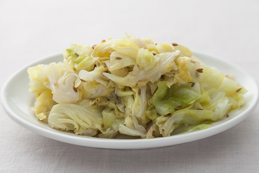 ざく切りにしたキャベツを蒸し煮にし、クミンシード・バター・塩で絡めます。ワインにもビールにもよくあう1品です。