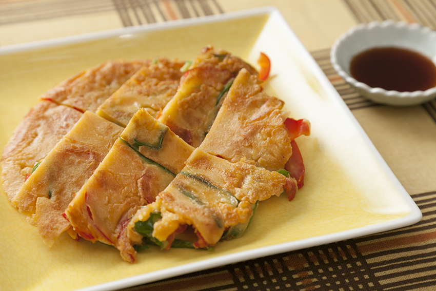 上新粉を使用することで独特の食感が生み出されます。パプリカピーマンの彩りも鮮やかです。