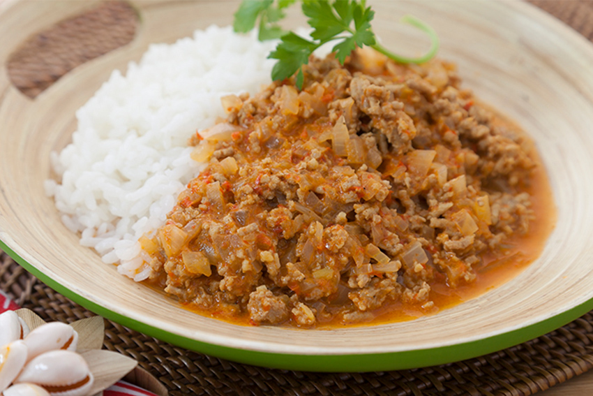 調理鍋に(1)のにんにく、生姜と玉ねぎ、豚ひき肉を入れて火にかけ塩、こしょう、カレー粉を加えさらに炒める。