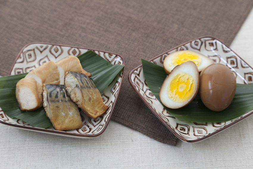塩鯖は4つに切る。鶏ささみは醤油とみりんで、茹で卵は皮をむいて醤油で30分ほど漬けておく。