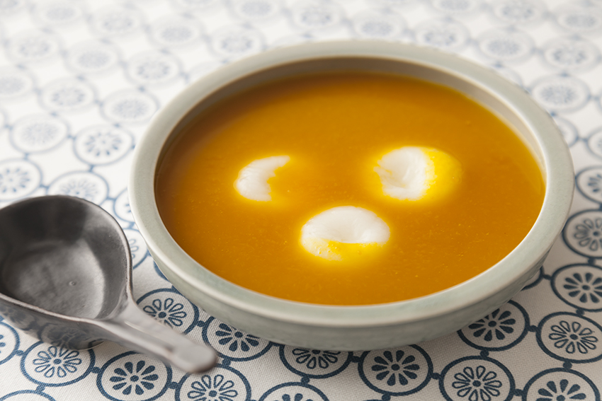 かぼちゃの甘みを生かしたかぼちゃスープ。裏ごししてなめらかに。黄色の汁に白い白玉を浮かべて!