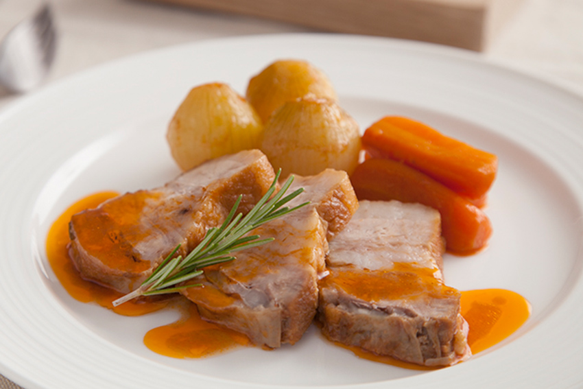 やわらかく煮込んだ豚ばら肉を酸味の効いたソースでいただきます。ワインにも合う一品です。