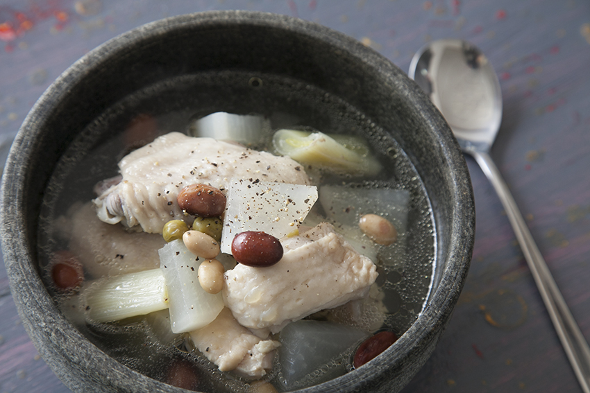 鶏もも肉を一口大に切り、手羽先は関節を切り落とし、塩・黒粒こしょう・しょうがを鶏肉にすりこみ、30分間漬け込む。大根は、厚さ1cmのいちょう切り、長ねぎは長さ3cmのぶつ切りに切っておく。