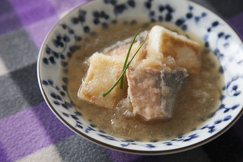 すりおろした大根で鮭がさっぱりとたべられます。揚げ焼きしたお餅がアクセント。