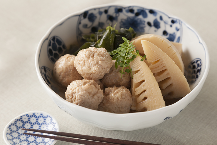 軟骨入りの肉団子の触感が抜群。旬のたけのことわかめと共にさっと煮て仕上げます。