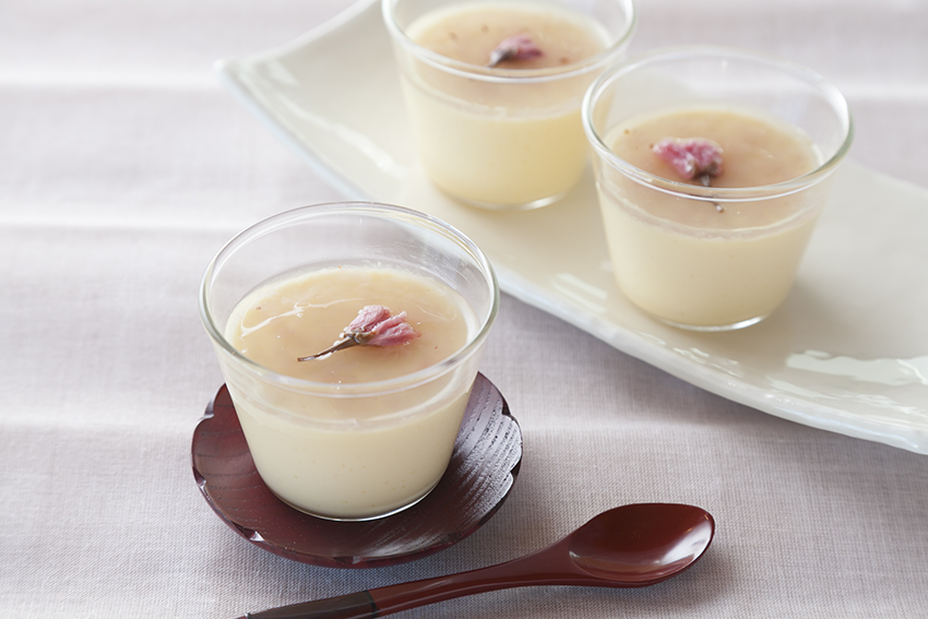 桜の葉で香りを移したプリンに桜の花びらを加えたソースをかけていただきます。桜の花が咲いたような春らしいデザート。