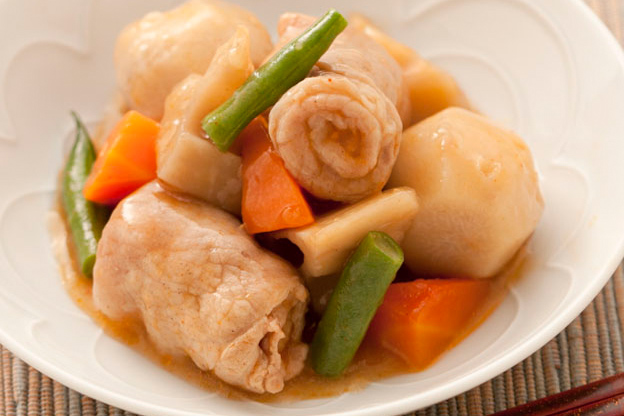 薄切りの豚肉を巻いて一口大のお肉にする事で柔らかく味の馴染みも良なります。ほんのりピリ辛煮込み。