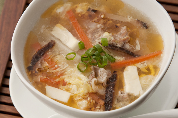 調理鍋に水とガラスープ顆粒入れて加熱し、沸騰したら干し椎茸、たけのこを入れひと煮立ちさせ、豚肉をほぐしながら入れる。アクを取ったら調味料(B)を入れ、絹ごし豆腐と春雨を加え、水溶き片栗粉でとろみをつけ、酢と溶き卵を流し入れフタをして1分加熱する。