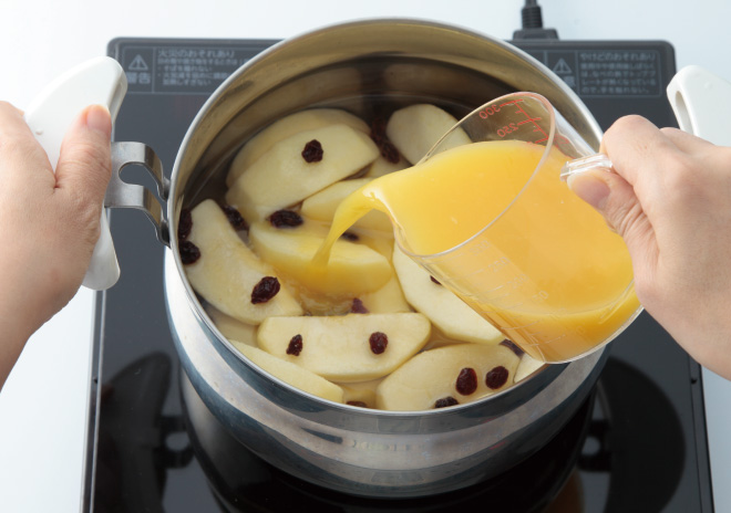 調理鍋にリンゴ、干し葡萄を入れ、「材料A」を砂糖、蜂蜜(ここで全体を軽く混ぜ合わせる)、水、オレンジジュースの順で加え、フタをして加熱する。
