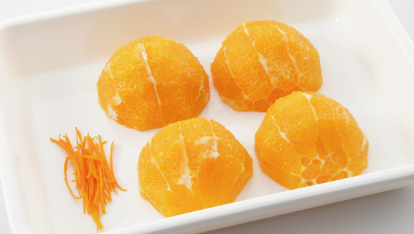 オレンジは、外の皮の白い部分を残さないように剥き、縦に半分にしておく。剥いた1/4個分のオレンジの皮を取っておき、白い部分を丁寧に取り除き、細いせん切りにして一度茹で溢しておく。