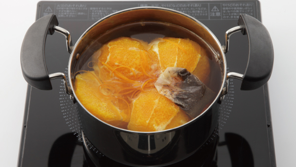 所定の時間経過後、オレンジとオレンジの皮をタッパ等に移し入れる。調理鍋に残った煮汁を再加熱して、とろみがつく程度煮つめシロップを作る。オレンジが入っている密閉容器にシロップを入れ、粗熱が取れたら冷蔵庫で冷やす。