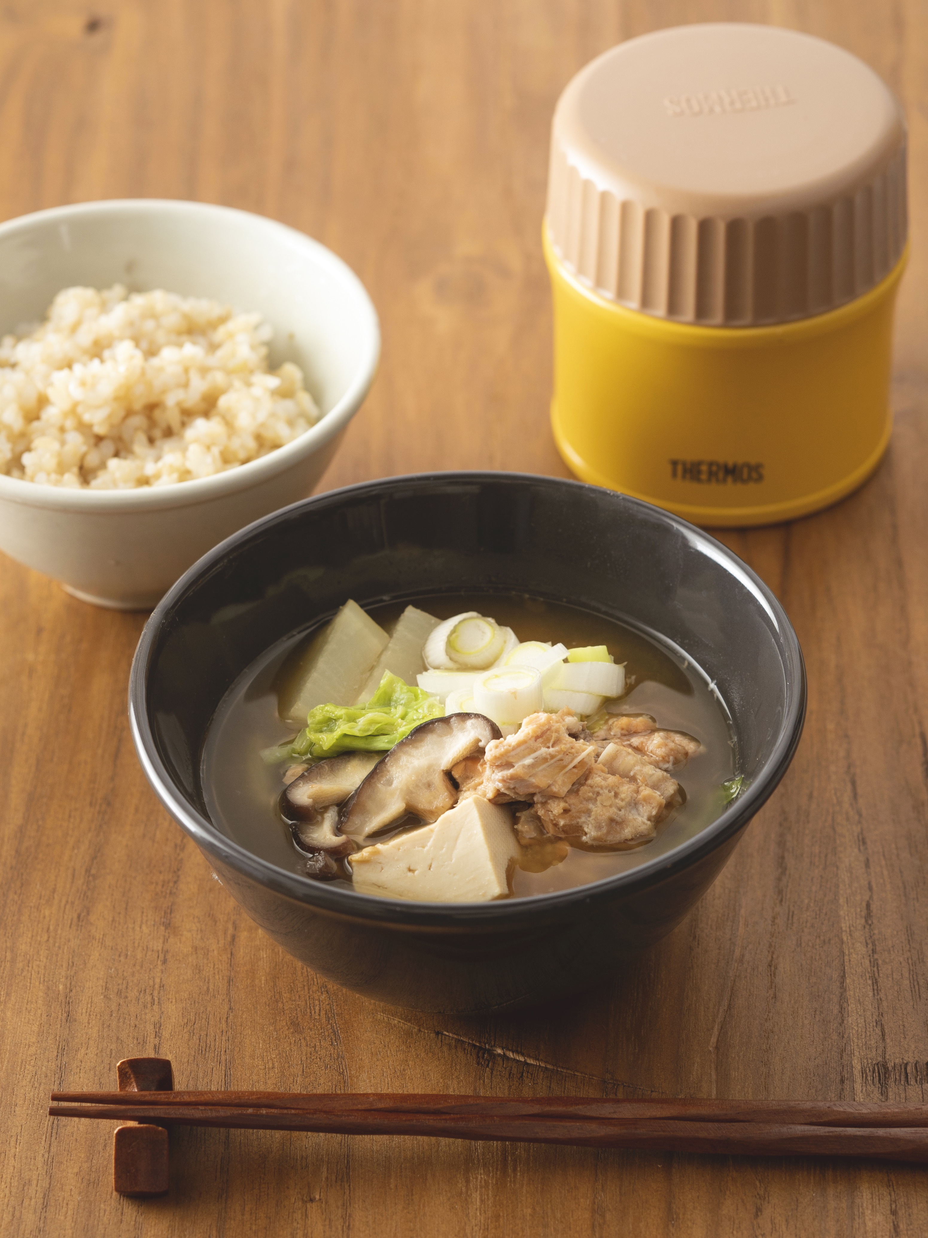 沸とう直前で火を止め、予熱しておいたスープジャーに熱々のうちに移し入れ、すぐにフタをする。