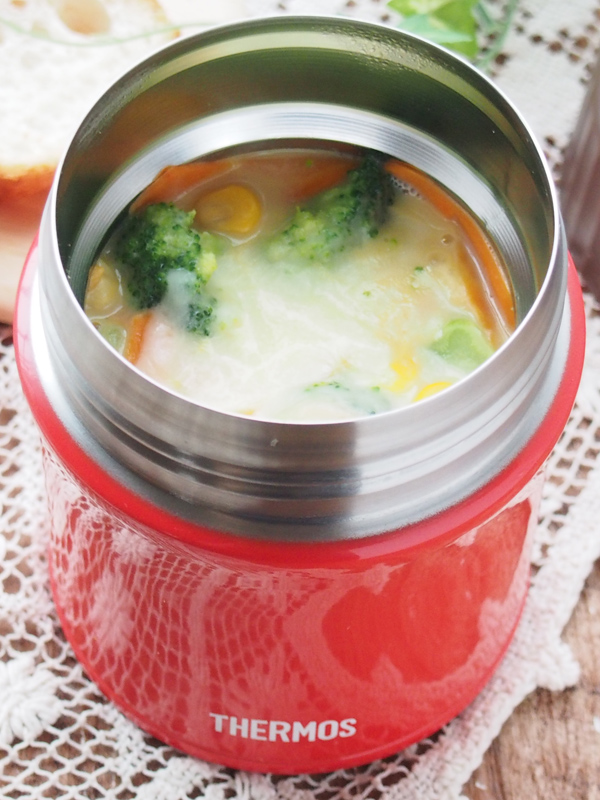 スープジャーのお湯を捨てて、1を注ぎ、ピザ用チーズをのせ、1時間半以上保温する。