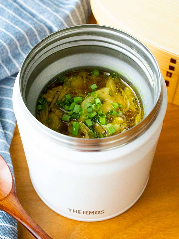スープジャーの湯を捨て、2 を入れる。お好みで青ねぎ(小口切り)をのせる。フタをして30分以上保温する。