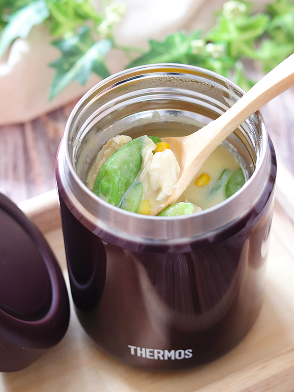 スープジャーの湯を捨て、鶏ささ身、スナップえんどうを入れる。その上から、1 のスープを注ぎ、フタをする。