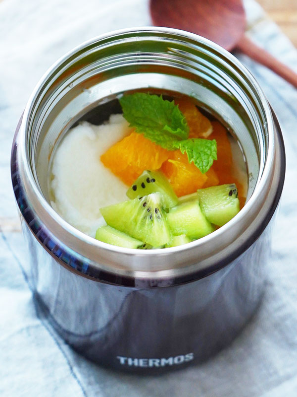 スープジャーの氷水を捨て、水気を軽く取り除いて 2 を入れる。皮をむいて1cm角に切ったオレンジとキウイをのせたらミントを添える。