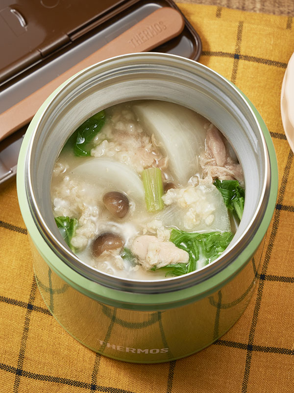スープジャーの湯を捨て、2とオートミールを入れさっと全体を混ぜ、フタをし10分以上保温する。